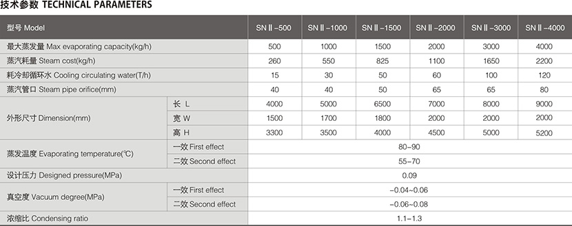 ◎ 使一效和二效蒸發(fā)比1.1 : 1,即蒸汽消耗與蒸發(fā)比0.55 : 1,使二次蒸汽得到充分利用,即節(jié)能蒸汽也節(jié)約冷卻水循環(huán)量。